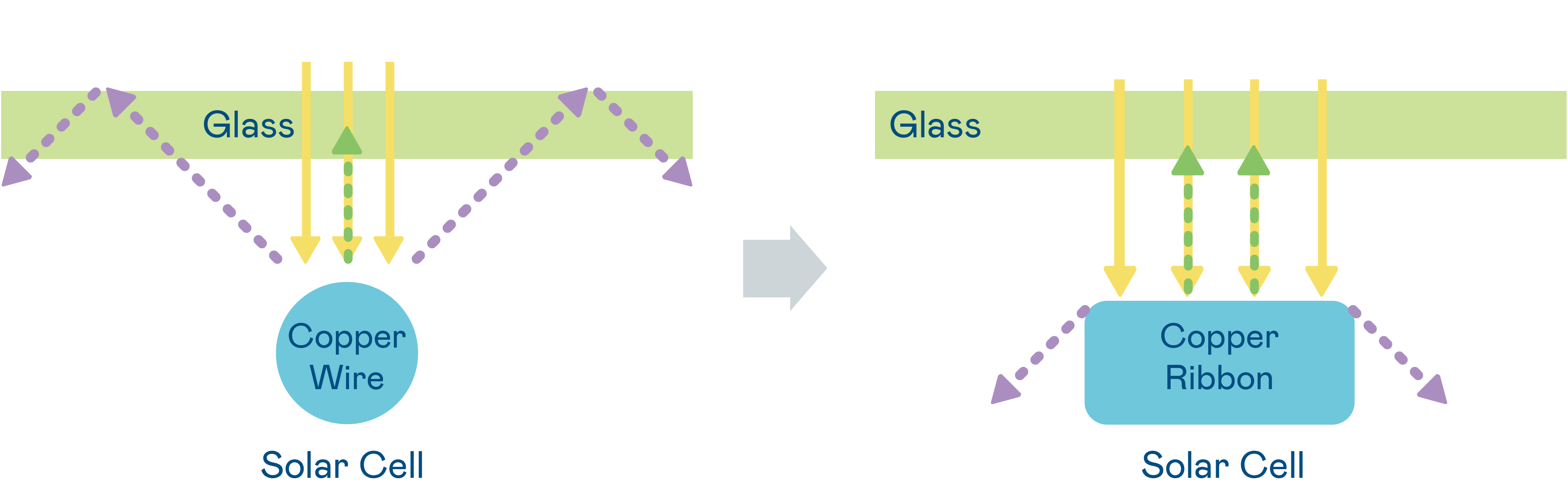 • The solar cell utilizes multiple strands of copper wire to form shorter current paths and improve current collection efficiency; the round copper wires increase the amount of light incident to the battery compared to traditional flat copper ribbons.
