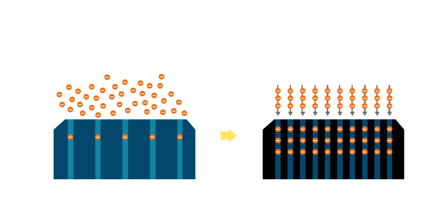 • 電池使用多條銅導線 (Copper wire) 于電池片上形成較短的電流路徑,提高電流收集效率,采用圓形設計的銅導線較傳統扁平式的銅焊帶 (Ribbon),可增加入射至電池的光線量。