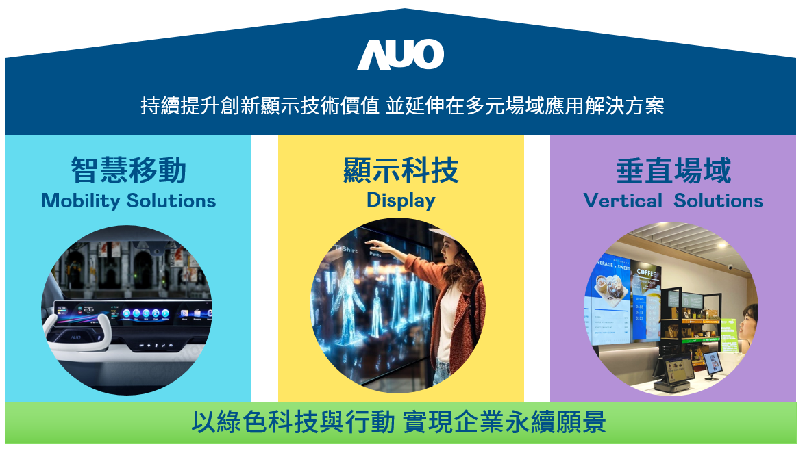 我們持續(xù)推動(dòng)「雙軸轉(zhuǎn)型」,在精進(jìn)顯示技術(shù)附加價(jià)值(Go Premium),與深化垂直市場應(yīng)用(Go Vertical)的策略下,對(duì)應(yīng)友達(dá)的優(yōu)勢競爭力與趨勢,我們奠定顯示技術(shù)、智慧移動(dòng)、垂直場域三大永續(xù)營運(yùn)支柱,在顯示技術(shù)領(lǐng)域的根基之上,延伸布局多元場域應(yīng)用解決方案。將先進(jìn)顯示科技助力智慧移動(dòng)及垂直場域發(fā)展,並以綠色科技與行動(dòng)為實(shí)踐,在轉(zhuǎn)型之路上貫徹永續(xù)經(jīng)營之願(yuàn)景。